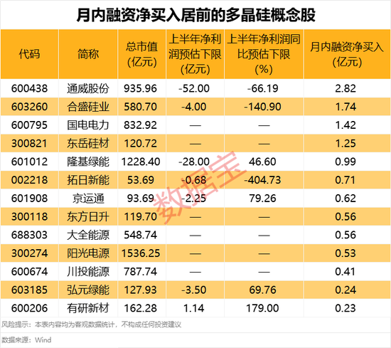 从资金面来看,受益于期货持续上涨,大多数多晶硅概念股获得市场资金的关注,通威股份、合盛硅业、国电电力、东岳硅材月内获融资净买入居前,均超1亿元。