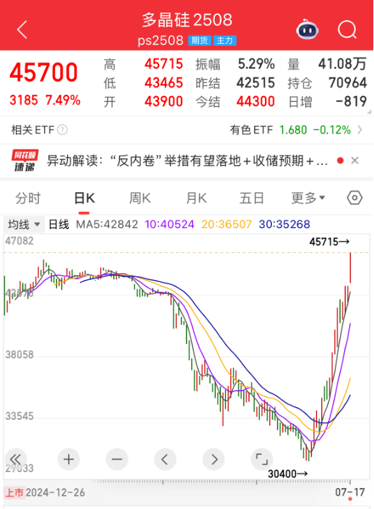 事实上,自7月以来,随着“反内卷”政策预期扰动,市场看多情绪逐渐发酵,此前跌破行业成本线的多晶硅期货低位反弹。目前多晶硅期货已经连续四根周线收涨,区间累计涨幅超44%。